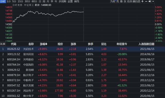国防军工板块午后持续走强,指数涨2.14%,成份股多数上涨,光启技术涨停,亚光科技涨超8%,光电股份、中国海防涨超6%。