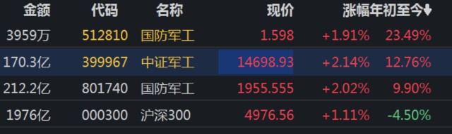 国防军工ETF(512810)年内累计涨幅23.49%,大幅超过同期中证军工指数12.76%、以及国防军工指数9.9%的涨幅,持续领跑A股上市国防军工类ETF。