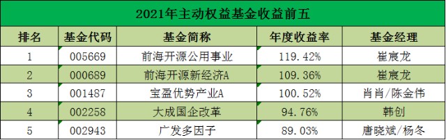 最后,对于基金投资者来说,相信大家都比较关心2021年哪些基金全年业绩占领前三,目前根据券商中国统计数据显示,在2021年A股震荡走势下,仍有3只基金实现翻倍。其中前海开源基金经理崔宸龙凭借对新能源行业的坚守,其掌管的 前海开源公用事业行业股票 (005669)以119.42%的年度收益率稳居首位,因此崔经理也成为2021年度收益率排名冠军基金经理,其管理的另一只基金 前海开源新经济灵活配置混合A (000689)年度收益率109.36%,年度排名第二;其次,宝盈基金的肖肖和陈金伟经理共同掌管的 宝盈优势产业灵活配置混合A (001487)年度收益率100.52%,年度排名第三,对于能够跟随这些经理进行布局一年的朋友,相信也是能够赚的盆满钵满了!