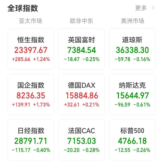 欧洲股市方面,周五欧股主要指数小幅下跌。截止收盘,英国伦敦100指数31日报收7384.54点,跌幅为0.25%;法国巴黎股市CAC40指数报收7153.03点,跌幅为0.28%;德国法兰克福股市当日休市。