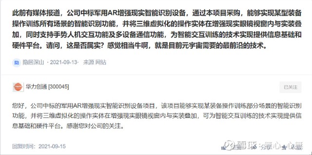 华力创通3月份中标军用AR增强现实智能识别设备,该设备要求“能够实现某型装备操作训练所有场景的智能识别功能,并将三维虚拟化的操作实体在增强现实眼镜视窗内与实装叠加,同时支持手势人机交互功能及多设备通信功能,为智能交互训练的技术实现提供信息基础和硬件平台。”设备交付了吗,用户反响如何?华力有考虑将相关技术用于民用需求吗?