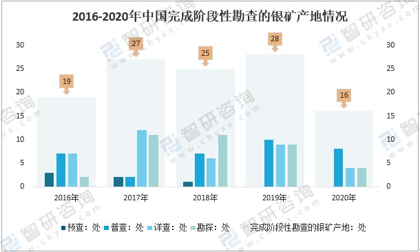 中国地大物博,银矿资源丰富,分布较为广泛,且矿区较为集中,开采方便,质地优良,主要银矿资源查明储量不断增长。2019年中国完成阶段性勘查的银矿产地28处,较2018年增长3处,其中:普查10处,详查9处,勘探9处;2020年中国完成阶段性勘查的银矿产地16处,较2019年减少12处,其中:普查8处,详查4处,勘探4处。