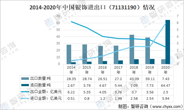 在生产方面,中国已成为全球最大的银饰加工基地之一,中国每年要向其它国家及地区出口大量的银饰,2020年由于新冠疫情及其它环境因素的影响,中国银饰出口量出现急剧下降,而进口数量出现猛增,2020年中国银饰出口数量7.43吨,较2019年减少31.68吨;进口数量64.47吨,较2019年增长56.74吨。从进出口金额来看,2020年中国出口银饰2.50亿美元,较2019年减少1.06亿美元;进口银饰5.94亿美元,较2019年增长3.4亿美元。