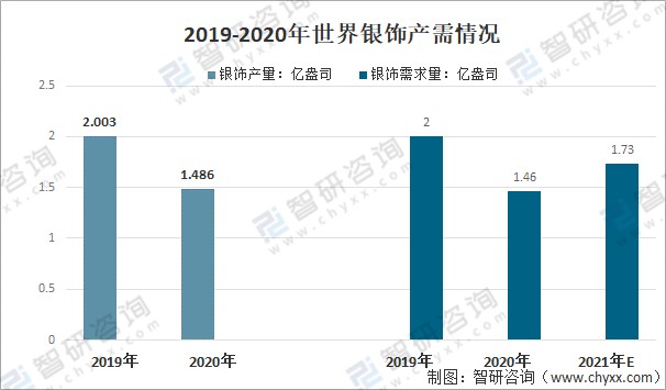 2019年全球银饰产量2.003亿盎司;2020年全球银饰产量1.486亿盎司,较2019年的银饰产量下跌26%,主要归因于印度造成的重大损失,以及受疫情影响而关闭的零售商店与工厂。随着银饰主要国际市场的业务在疫情解封后持续改善,预计到2021年底银饰需求将会增加。银饰需求有可能会从2020年的1.46亿盎司增加18%至1.73亿盎司。