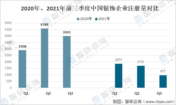 2021年前三季度中国新增银饰相关企业明显少于去年。一季度新增银饰企业1873家,较2020年同期减少1035家;二季度新增1713家,较2020年同期减少2875家;三季度新增977家,较2020年同期减少3014家。