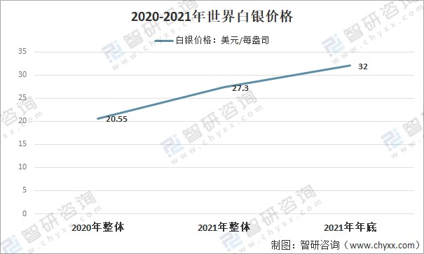 预计白银价格将在2021年年底升至每盎司32美元的峰值。2021年的整体平均价格将达每盎司27.30美元,比2020年的每盎司20.55美元上涨了33%。