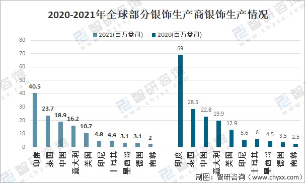 疫情对传统的第一季购物高峰期构成影响,消费者情绪亦仍然疲软,导致中国制造力急剧下降。2020年中国生产银饰22.8百万盎司;2021年生产银饰18.9百万盎司,同比下降17%,排名第三,排名第二的是泰国,2021年银饰生产从2020年的28.5百万盎司下降至2021年的23.7百万盎司,降幅17%;排名第一的仍是印度,2020年印度生产银饰69百万盎司;2021年生产银饰40.5百万盎司,下降41%。