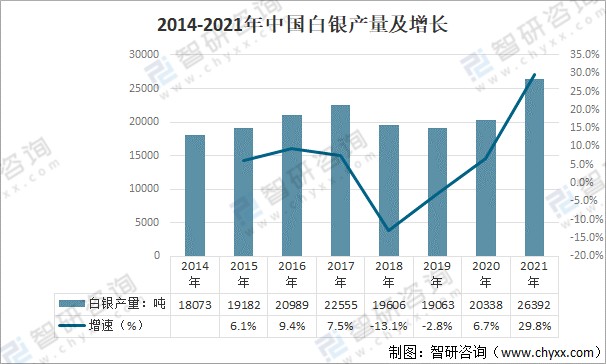 2014-2017年中国白银产量逐年增长,2018年、2019年出现两年降,2020年开始回升,截止2021年中国白银产量26392吨,同比增长29.8%。