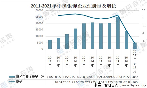 丰富的银矿资源为中国银饰行业发展奠定基础,银饰价格波动相对较小,市场相对稳定。近十年来,中国银饰相关企业注册量总体呈上升趋势。2018年中国新增银饰相关企业2.02万家,同比增长1.17%。2019年新增2.51万家,同比增长19.70%,是新增银饰相关企业最多的一年。2020年新增银饰相关企业新增1.41万家,同比减少78.85%。2021年前11月,中国新增银饰相关企业5052家,同比减少160.69%。