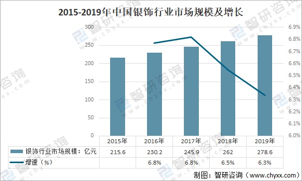 随着中国人均收入的增长,20岁及以下消费群体消费能力提升,其对于首饰需求持续增长,进而推动时尚银饰产业的发展,近几年中国银饰市场规模稳定增长。2018年,中国银饰行业市场规模为262亿元,较上年同比增长6.5%;2019年,中国银饰行业市场规模为178.6亿元,较上年同比增长6.3%。