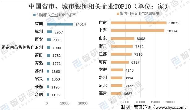 从区域分布来看,广东以1.88万家银饰相关企业排名第一;上海有1.82万家银饰相关企,排在第二;山东有8008家银饰相关企,排在第三名。浙江、江苏、河南、安徽、贵州、河北、福建依次挤进全国前十,银饰相关企业数量分别为7512家、7116家、6127家、4143家、3994家、3922家、3687家。从城市分布来看,深圳有1.45万家银饰相关企业,位居榜首;杭州有银饰相关企业2957家,排名第二;西安有银饰相关企业2175家,排名第三。黔东南苗族侗族自治州、莆田、青岛、苏州、绍兴、合肥、长春依次挤进全国前十,银饰相关企业数量分别为1900家、1782家、1771家、1360家、1353家、1195家、1195家。