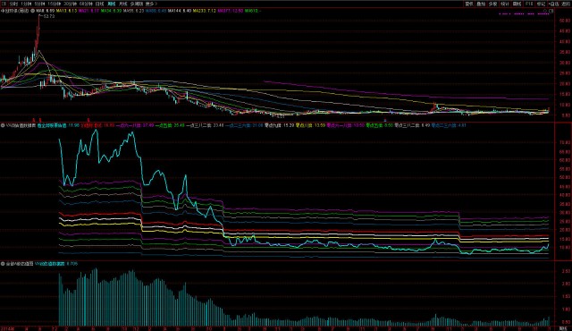 3.为了便于观察估值线与价值标准线的关系,在标准线上方画了四根线,数值分别是标准线的1.618倍、1.5倍、1.382倍和1.236倍;下方画了六根线,数值分别是标准线的0.9倍、0.8倍、0.618倍、0.5倍、0.382倍和0.236倍。