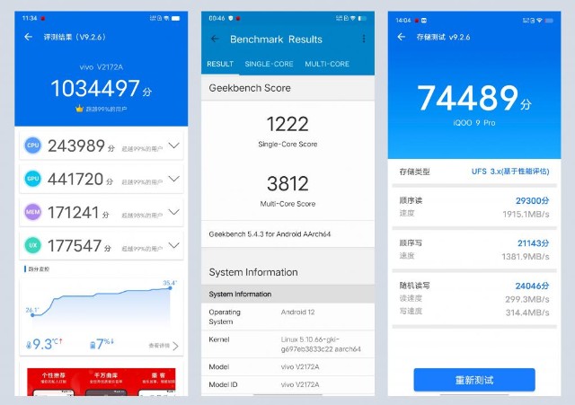 作为新一年的主力旗舰,iQOO 9 Pro 自然搭载了骁龙 8 Gen 1 芯片,相较于骁龙 888,它的工艺和架构再次升级,峰值性能也更进一步。我们对其进行了跑分实测,在安兔兔最新版本中,它的成绩为 1034497 分,而在 Geekbench 5 中,单核成绩为 1222 分,多核则为 3812 分。这样的成绩是目前所有骁龙 8 机型中表现最好的,这也从侧面反映出它的散热和性能释放能力非常出众。而在存储方面,它配备了 LPDDR5 6400Mbps 增强版内存(照例支持内存融合技术)以及超频版 UFS3.1 闪存芯片,其中闪存读写成绩也比上代提升了许多。