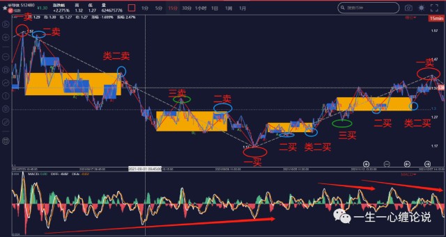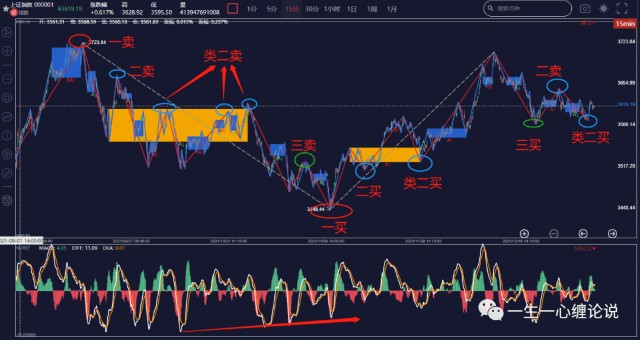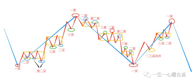 图片说明:蓝色线段为本级别走势类型;红色线段为本级别线段;黄色方框为本级别中枢;图示圆圈为各种买卖点。