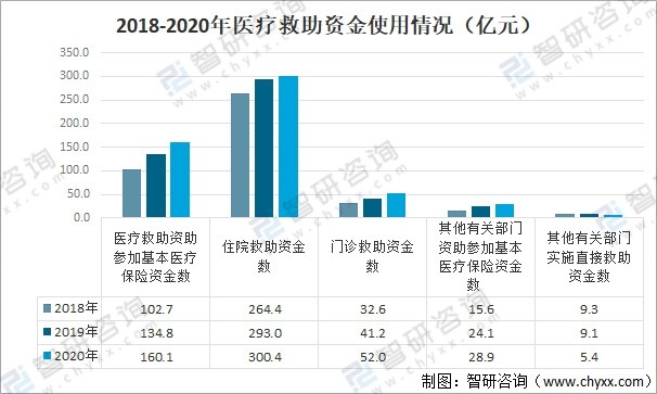 2020年医疗救助资助参加基本医疗保险资金为160.0亿元,其中资助重点救助对象参加基本医疗保险资金数82.7亿元;住院救助资金数为300.4亿元,其中重点救助对象救助资金数 177.5亿元,重特大疾病医疗救助资金数74.7亿元。