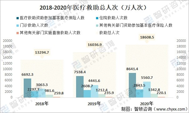 根据国家医疗保障局数据:2020年医疗救助总人次18608.5万人次,其中医疗救助资助参加基本医疗保险人数8641.4万,人次住院救助2843.5万人次,门诊救助5560.7万人次,其他有关部门资助参加基本医疗保险1342.8万人次,其他有关部门实施直接救助220.1万人次。