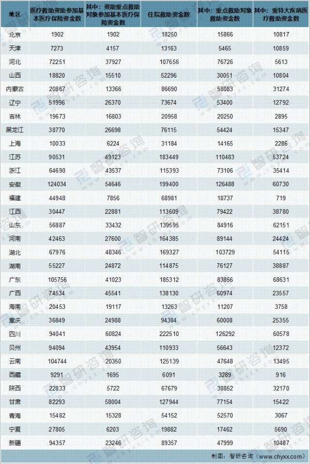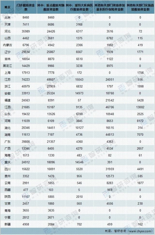 其中安徽省、江苏省、四川省、广东省医疗救助总金额超30亿元,其次超20亿元另有11个省份,分别为湖北、云南、河南、湖南、广西、山东、江西、浙江、贝州、河北、甘肃;超10亿元另有7个省份。