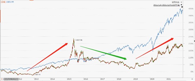 来源:Wind,2011年至2021年,红色为创业板指,蓝色为纳斯达克指数