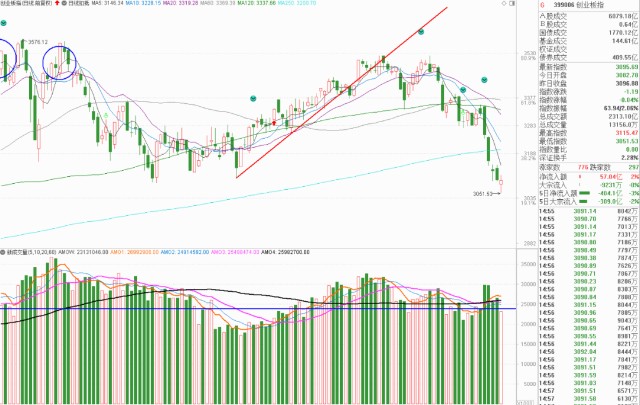 创业板指数,我们观点也很清楚,这个地方再往下继续大幅杀跌的可能性不高,但是能不能阳线收上来,关键是看成交量。