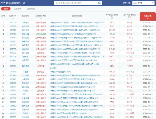 业绩预告一览