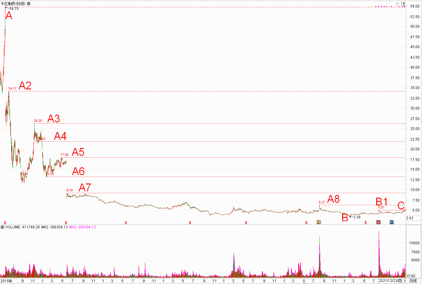 1、跌幅达标。该股从A峰跌到B底,最大跌幅超过93%,完全符合5580的标准。而5580的标准,则是涨停板学理论的大趋势底部,一旦达标并确认,后面将会出现强势的反弹甚至反转。从这点上说,千红制药后面应该要有一波强势的反弹。