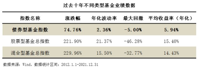 过去十年,债券型基金指数的年化波动率仅有2.36%,最大回撤仅5%,仅为股票型基金总指数的11%,混合型基金总指数的15%。(数据来源:Wind,数据统计区间:2012.1.1-2021.12.31)