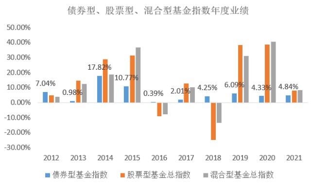 从长期业绩来看,过去十年,债券型基金总指数的平均收益率(年化)也有5.94%,属于相当不错的收益水平。尽管收益水平较股票型基金总指数(15.4%)、混合型基金总指数(14.43%)有所差距,但债券型基金仍受到各类投资者认可。(数据来源:Wind,数据统计区间:2012.1.1-2021.12.31)