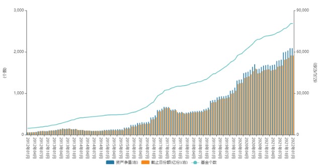 过去十年债券型基金数量与份额、净值变化