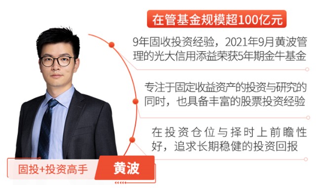 挑选债基的关键之一在于基金经理。光大保德信基金的基金经理黄波先生,是一位有着多平台经验、9年固收投研经历、穿越牛熊的老将。他的代表作于2021年获得了素有金融界“奥斯卡”之称的金牛奖,旗下管理规模已超百亿,广受赞誉,正是投资者要寻找的明星基金经理之一