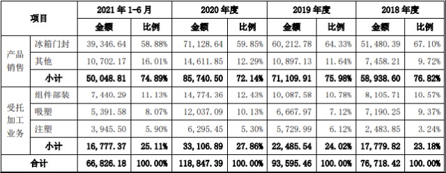 主营构成:从2020年收入构成看,主要产品为冰箱门封占比59.85%。公司冰箱门封直接销售给下游冰箱主机厂取得收入。公司组件部装业务、吸塑业务、注塑业务主要为受托加工。加工服务收入系公司从冰箱主机厂调拨或其指定供应商采购主要原材料,公司提供部分辅料,在产品加工完成后直接销售给冰箱主机厂。