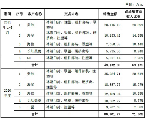 主要客户:公司主要客户为美的、海尔、海信等,为其冰箱门封的主要供应商。