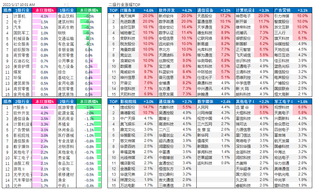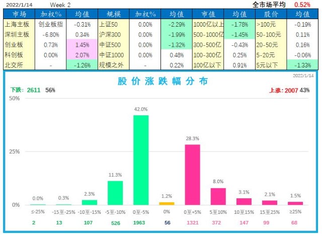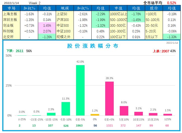 本周整个市场走势分化,2022-01-14 全市场 A 股(不含近期新股)平均涨幅 0.52%;