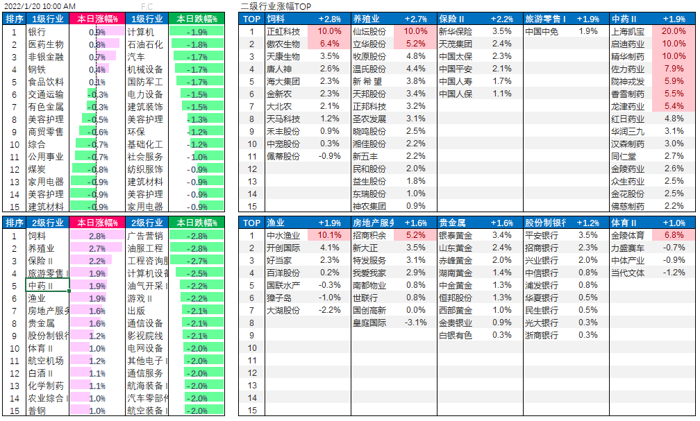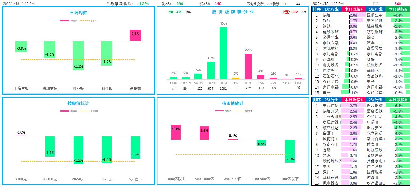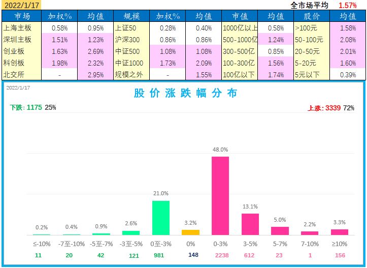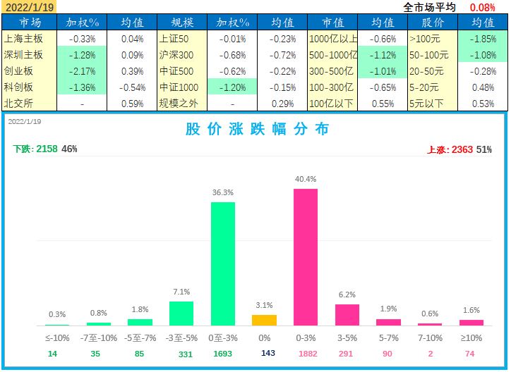 2022-01-20全市场A股(不含近期新股)平均涨幅-2.28%; (上证综指-0.09%\深成指-0.06%\创业板指数-0.32%); 总成交11329亿; 资金净流-354亿; (不含近期新股)上涨家数807占比17.3%,下跌家数3808占比81.6%。