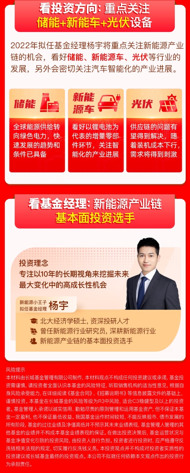 总结来说,2022年我们判断储能、新能源车、光伏等产业仍将快速发展,同时国内的优质公司在诸多环节已然处于领先地位、投资价值突出,因此2022年我们仍将聚焦于整个新能源行业,与产业共同进步。