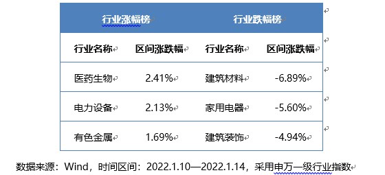 自2022.1.10—2022.1.14,上证指数下跌约1.63%,深证成指下跌约1.35%,创业板指上涨约0.73%。行业板块方面,医药生物、电力设备、有色金属等涨幅居前,建筑材料、家用电器、建筑装饰等行业涨跌幅靠后。