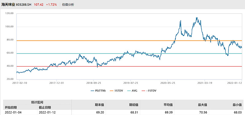 截至2022年1月12日,海天味业的市盈率为69.20倍,处于近5年71.58%的历史分位点。(数据来源:Wind)