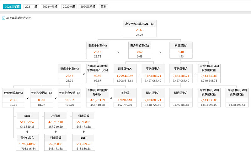截至2021年9月30日,海天味业的ROE为22.68%,其中销售净利率为26.16%,资产周转率为0.62,权益乘数为1.40。