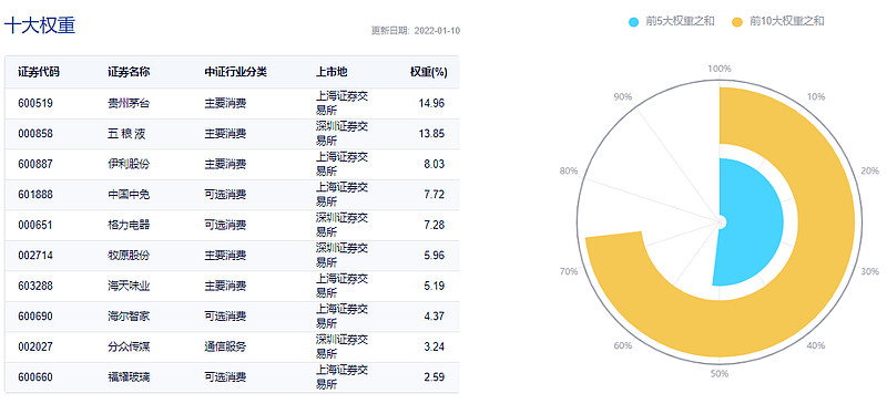从投资门槛的角度来看,消费板块龙头股普遍价格较高。以2022年1月10日收盘价为例,消费龙头ETF(516130)持仓50只消费龙头股中,12只股票的交易门槛超1万元,其中投资贵州茅台一手超过19万元!