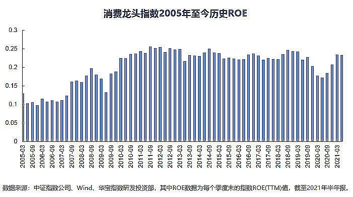 截至2021年半年报,消费龙头ETF(516130)跟踪的消费龙头指数历史平均ROE(TTM)为20.27%,且在过去十年中表现非常稳定。当下,能够提供较高ROE且长期稳定的资产具备显著的配置价值。(数据来源:中证指数公司、华宝基金)