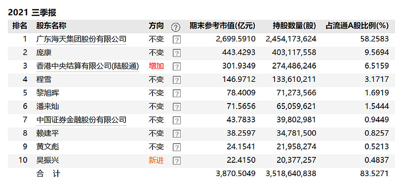 截至2021年9月30日,海天味业前十大流通股东合计持股占流通A股比例83.53%,广东海天集团股份有限公司以58.26%的比例高居首位,香港中央结算有限公司(陆股通)以6.52%的比例位列第三位。(数据来源:Wind)