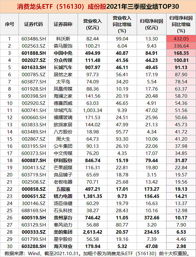 消费龙头ETF(516130)成份股2021年三季报业绩验证消费板块高景气!近7成归母净利润实现正增长!其中包括权重股中国中免、分众传媒在内的4股归母净利润同比增幅超100%,科沃斯以99.04%的营业收入同比增幅和432.05%的归母净利同比增幅登顶业绩榜单!包括权重股贵州茅台、五粮液、格力电器、伊利股份、长城汽车在内的23股2021年前三季度归母净利润同比增速实现两位数增长!