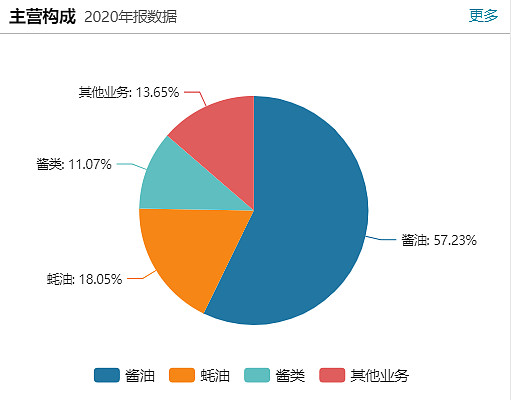 从最新年报来看,海天味业主营构成为:酱油:57.23%、蚝油:18.05%、酱类:11.07%、其他业务:13.65%(数据来源:Wind)