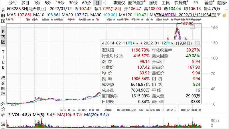拉长时间线来看,海天味业于2014年2月11日在上交所上市,截至2022年1月12日收盘价为107.42元,总市值达4525亿元,至此海天味业上市近8年时间股价增长近12倍!