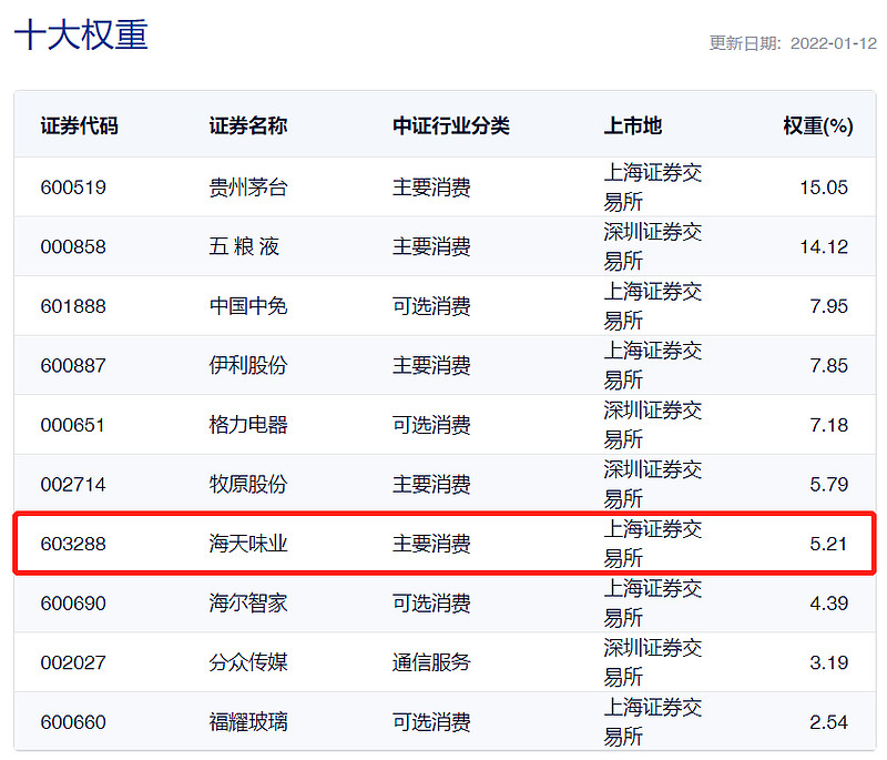 消费龙头ETF(516130)荟聚A股可选和必选消费中规模大、经营质量好的50只龙头股,海天味业作为大消费细分调味品板块的龙头公司,高居消费龙头指数第七大权重!截至2022.1.12,海天味业在消费龙头ETF(516130)仓位占比达5.21%。
