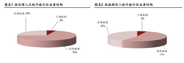 从收入贡献方面来看,国内旅游仍是对旅行社旅游业务收入贡献最大的业务,但出境旅游业务 41.54%的收入总量占比,叠加旅游人次仅占旅行社服务人数的 25%,可以说出境旅游业务能够为旅行社带来更多的收入贡献。