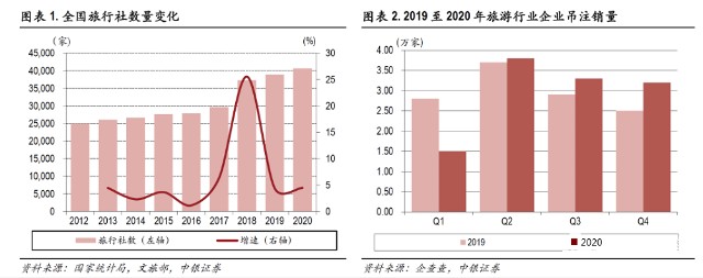 根据国家统计局数据显示,我国旅行社数量年均复合增速为 6.31%。据企查查大数据研究院《近十年旅游行业投融资数据报告》显示,20 年旅游行业吊注销企业达 11.8 万家,疫情对旅游行业企业的影响还是较为明显。总体来看,疫情可能加速中小及单体旅行社的出清,在一定程度上提升行业集中度。