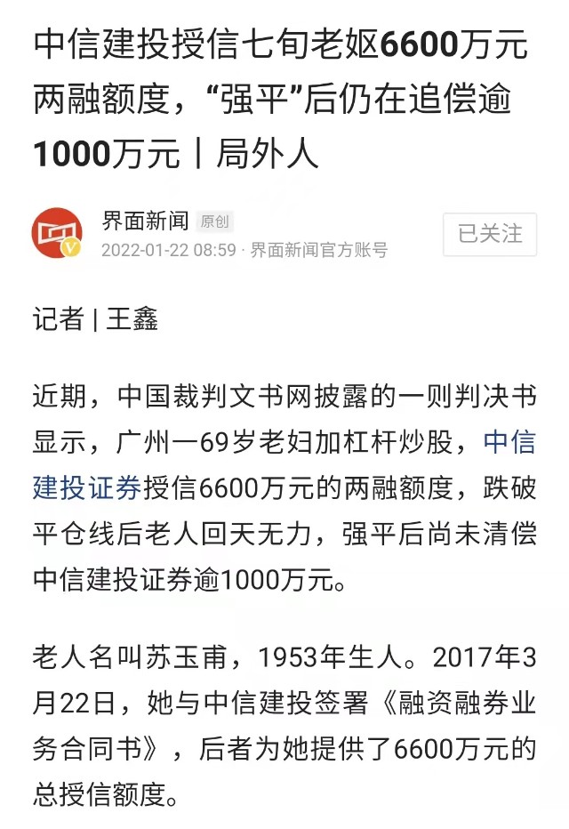 近期,中信建投证券公司因融资爆仓事宜,与一位近70岁的老妇对簿公堂,引起市场的极大关注。