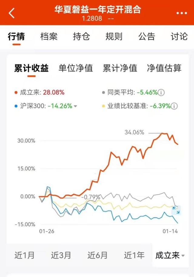 成立时间最晚的,最大回撤仅为5.6%的华夏磐益也同样表现出色。自去年1月26日成立到今年1月17日,华夏磐益收获了28.08%的涨幅,超越同期业绩比较基准34%,更是大幅超越了同期沪深300 指数42.3%: