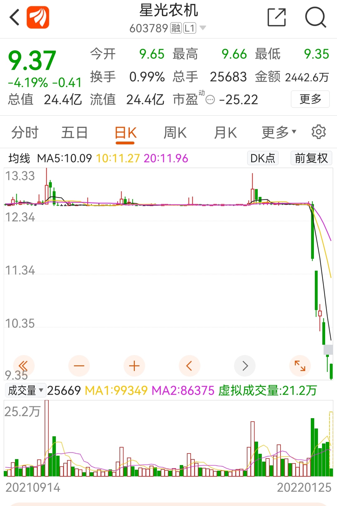 史上最强的“织布机”星光农机今天又大跌4%,自从主力变脸,不再“织布”之后,这只股票就开启了单边下跌走势,股价飞流直下三千尺,6个交易日有5天大跌,股价也从12.34元的织布价格,跌到9元多了,跌幅达25%!