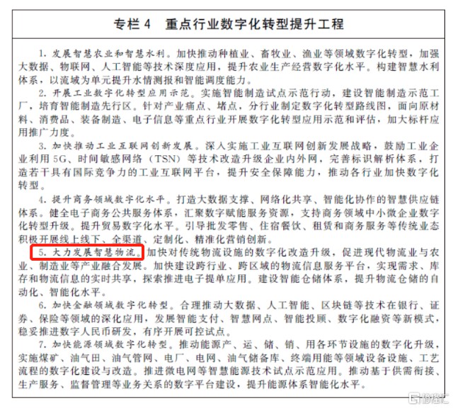 近期,伴随《“十四五”数字经济发展规划》、《“十四五”现代综合交通运输体系发展规划》等顶层规划接连出炉,相关主题板块应声上涨。长期来看,伴随数字经济与现代交运的部署“蓝图”正式落地,预示着中国数字化经济与交运行业正迈入发展新阶段,其中物流业作为国内战略基础性产业无疑是未来发展的“重头戏”。